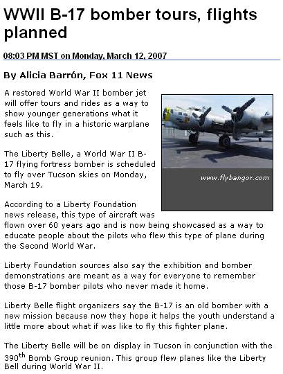 Leonard Rogers hasn’t flown on a B-17 airplane since his days in combat during World War II. After more than six decades, Rogers will fly again. The Youngtown resident has been chosen to accompany a Daily New-Sun reporter and photographer on a flight of "Liberty Belle," a newly restored World War II bomber, Monday in Phoenix. "Liberty Belle" was built toward the end of the war and never saw combat. It’s painted in colors and nose art of the original B-17 that flew countless missions with the 390th bomb group of the 8th U.S. Army Air Corps. "I’m so excited because I didn’t ever think I’d fly on another one again," he said. More than 15 people responded to the contest through phone calls and e-mail, sharing their memories of being aboard the historic plane. Bill Gill, an 83-year-old Sun Citian, was a pilot on a B-17 in 1944 and served in the U.S. Air Force 3rd Division of the 728th Squadron in England. He remembered when his plane was hit by a bomb and his crew parachuted to safety. "I thought I was the last person to get out of the plane and seconds later it blew up," he said. "I was told later that our tailgunner didn’t make it." Hazel Jaworski, a Sun City Grand resident, didn’t fly on a B-17 but helped manufacture parts for the plane. She built de-icers for the wings by hand with rubber cement strips. "We used hypodermic needles to get the air bubbles out," she said. "It was very exacting and precise work but enjoyable." Rogers, a retired major, flew on a B-17 as a tailgunner in 1944. He had several stories about his experiences. Some of his tales can soon be found on a Web site that’s being developed by his nephew. Rogers remembers when his crew had to parachute out of their plane after German fighters shot it down in Germany. He said he landed in a cow pasture when two French men hid him in the woods from the opposition. In the following weeks, Rogers and two crew members hid in different homes until they were flown back to London. They finally bought a boat and sailed back to their camp. Since the war, Rogers has only toured on a B-17. "You don’t know how much this means to some of us," he said. "I loved flying on those planes, and I’m sure it’ll bring back even more memories." |